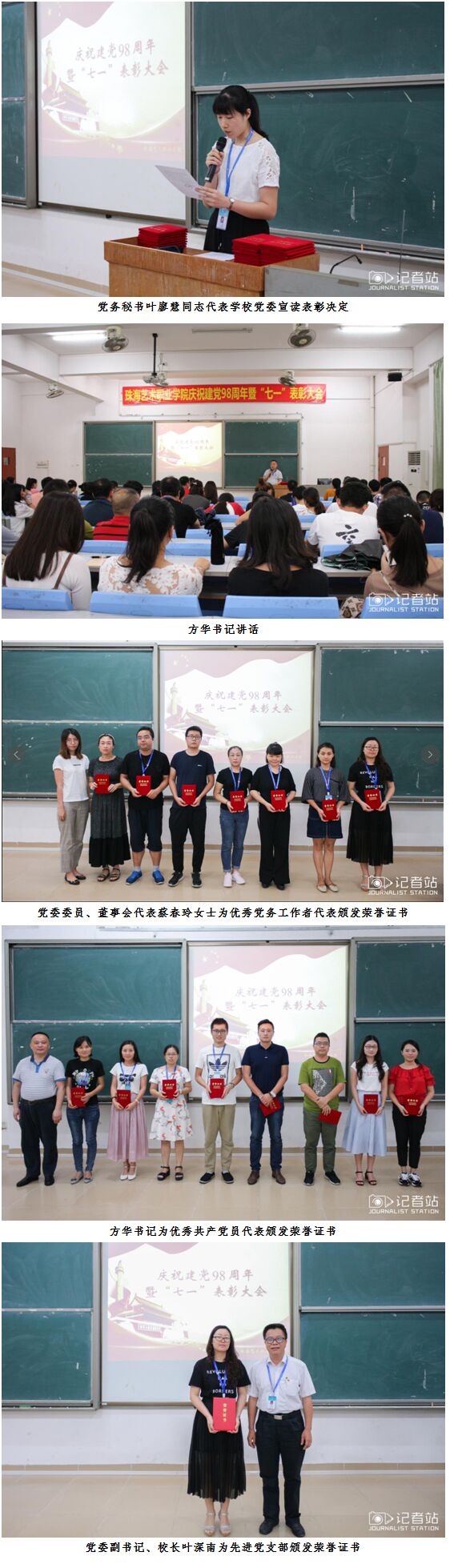 党务秘书叶廖慧同志代表学校党委宣读《关于表彰2018-2019学年优秀共产党员、优秀党务工作者和先进党支部的决定》。学校领导为受表彰代表颁奖。