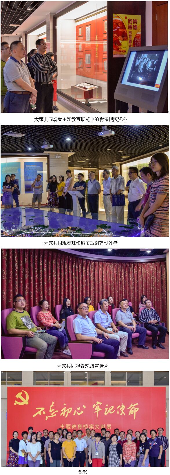 “不忘初心、牢记使命”主题教育档案文献展主要由理论探索、理想信念、不懈奋斗、牢记宗旨、自身建设等五大部分组成,通过一件件珍贵文献、一幅幅动人图片和一个个感人的革命事迹,真实再现了一代又一代中国共产党人坚定理想信念,坚守初心使命,矢志不渝为中国人民谋幸福、为中华民族谋复兴的光辉奋斗历程。“走进珠海”档案文献展则是通过文字、视频、沙盘、图片等形式,展示了珠海特区发展成就和四十年的沧桑巨变,大家进一步了解了珠海悠久灿烂的历史文化和改革开放以来取得的辉煌成就。