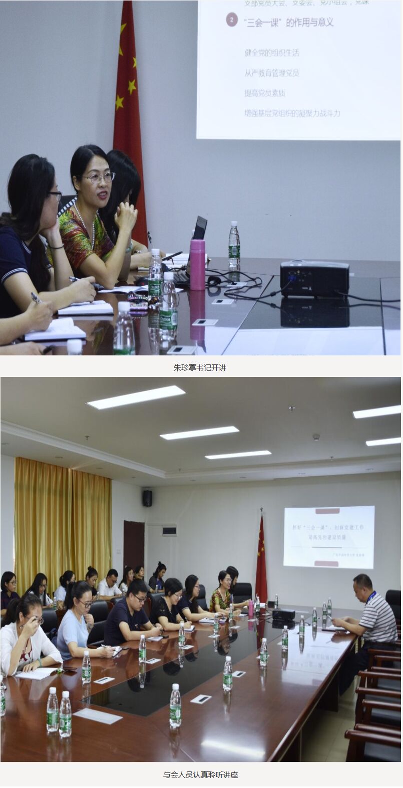 朱珍葶书记立足自身丰富的党务工作经验,结合我校基层党务工作情况,以《抓好“三会一课” 创新党建工作 提高党的建设质量》为题,从“确保‘三会一课’规范化、制度化、常态化”、“加强党建引领,提升党建育人成效”、“增强党支部的凝聚力创造力战斗力,推动学院发展”等三个方面开讲。