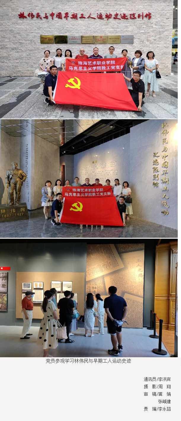 为贯彻落实习近平总书记在庆祝中国共产党成立100周年上的重要讲话精神以及党史学习教育的相关要求,按照学校党委统一部署,2021年7月6日下午,马院教工党支部开展了主题党日活动,前往金湾区三灶镇林伟民与早期工人运动史迹陈列馆参观学习,学校党委书记方华参加了此次活动。